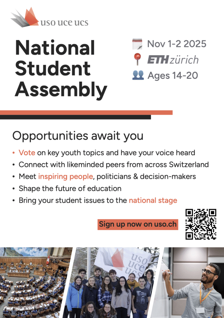 You’ll meet inspiring people, including politicians from Switzerland’s major parties and decision-makers, while directly shaping the future of education. Most importantly, it’s your platform to bring the issues from your school or region onto the national stage.